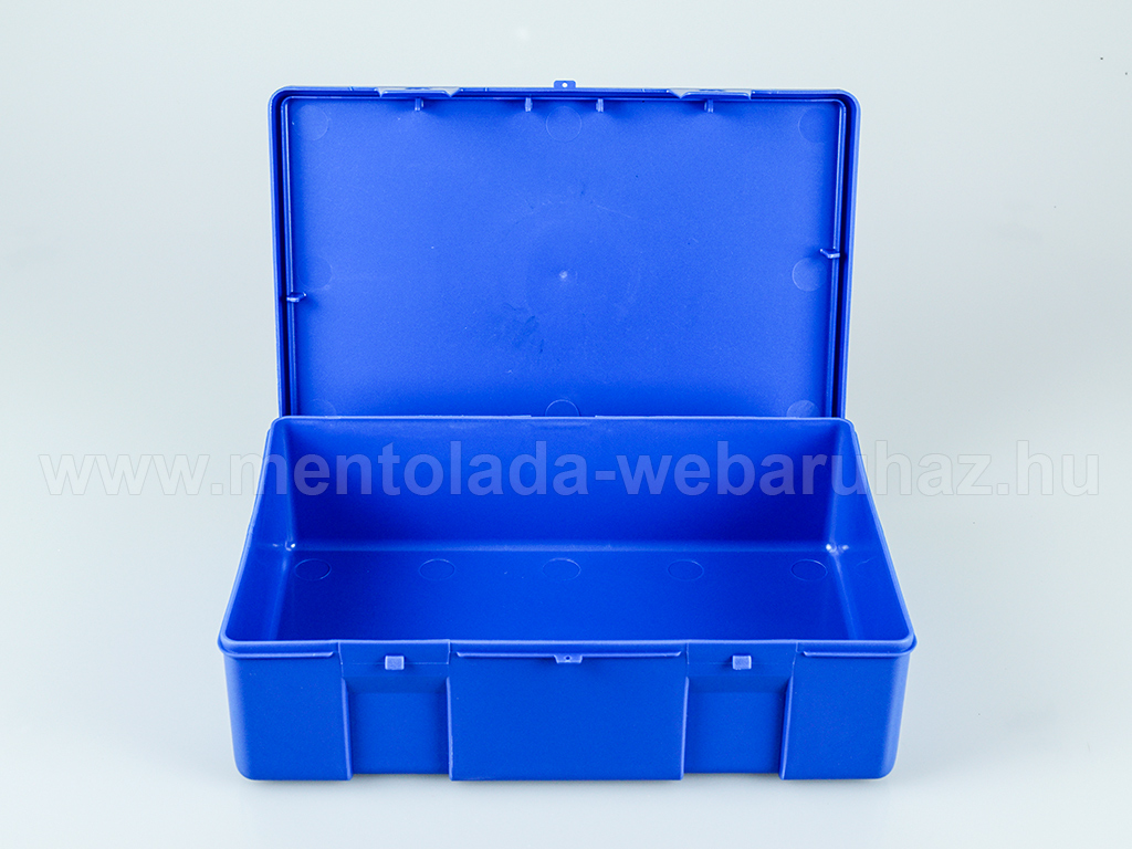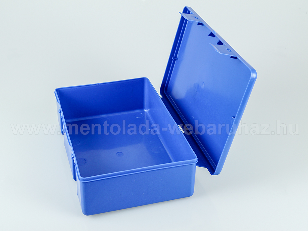 Kis méretű, kék színű műanyagdoboz, amely csattal záródik és plombázható.